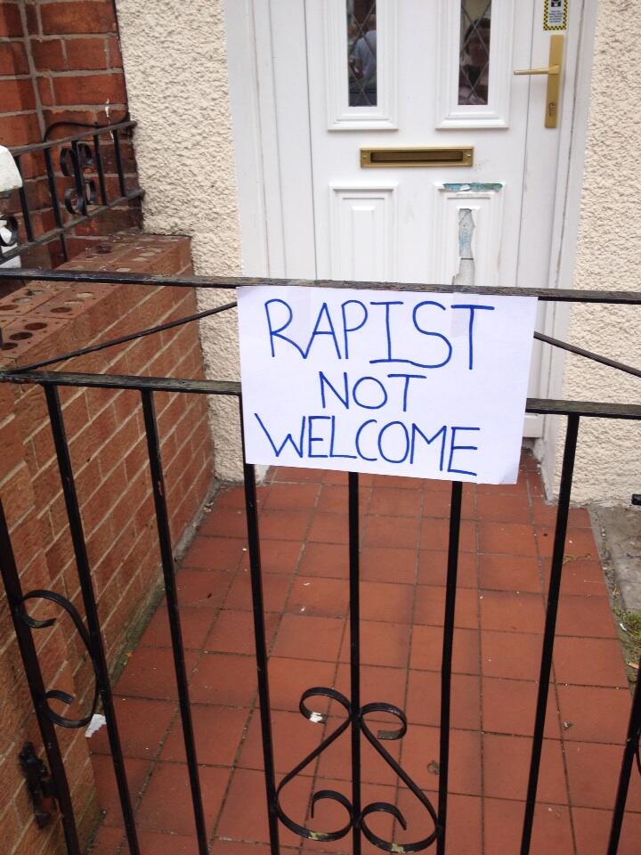 A sign stating “Sex Offender should not be released / resettled into our community”, was taped to the door of the house, while another stating “rapist not welcome” was fixed by local people to the front gate. Protests are to continue at 7pm nightly, until the community receive assurances that the man in question is no longer living there.